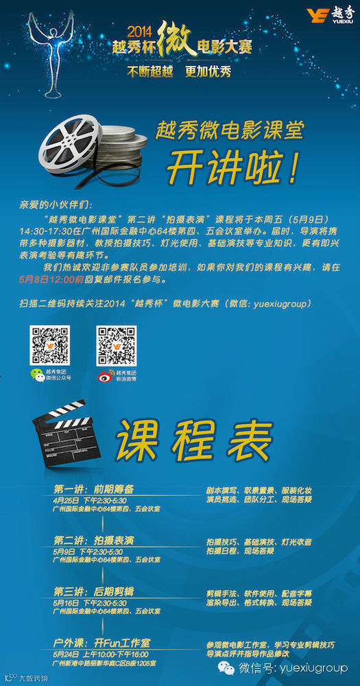 “越秀微电影课堂”第二讲“拍摄表演”课程本周五下午开讲!欢迎小伙伴们报名参加!