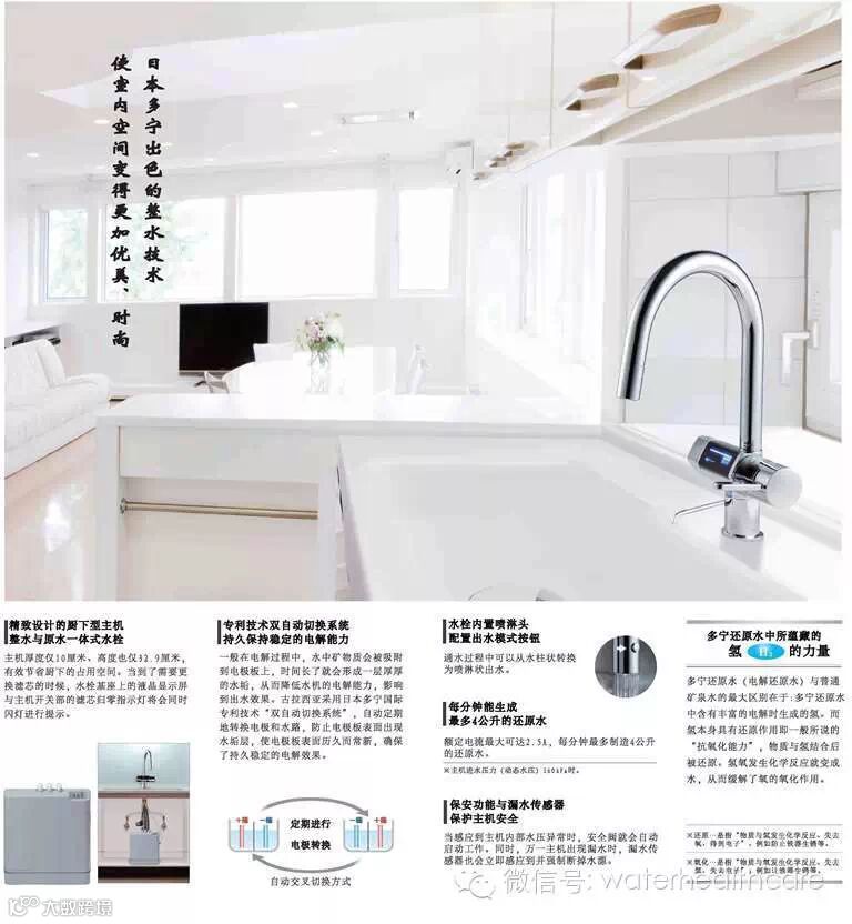 该产品开关控制设置在一体型水栓(取水龙头)基座,通过液晶触摸屏进行选择不同的水。由于主机安放在橱柜里面,因此橱柜台面简洁大方美观,更显尊贵豪华。