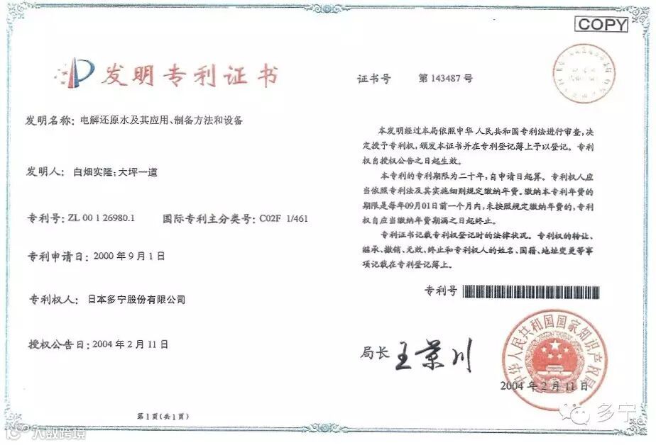 多宁电解还原水机的双自动切换式制水系统已于中华人民共和国、日本、美国、加拿大、俄罗斯、韩国、台湾等10余国家和地区获得国际专利证书。