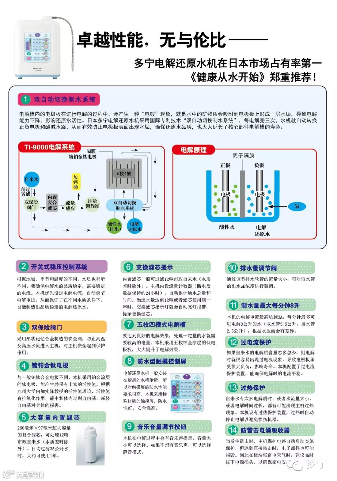 经典版的日本多宁电解水机,又名“多宁牌TI-9000型家庭用制水器”。搭载了日本多宁国际专利技术的“双自动切换系统”,每电解制水3次后,正负电极极和酸碱水路就同时变换,然后再电解3次后又一次变换回来,因此防止了电极板表面日积月累形成厚厚的一层水垢所导致的电解效果下降的问题,也延长了电极板寿命。此型号也是目前为止在国内市场最受欢迎的一款台式电解水机。