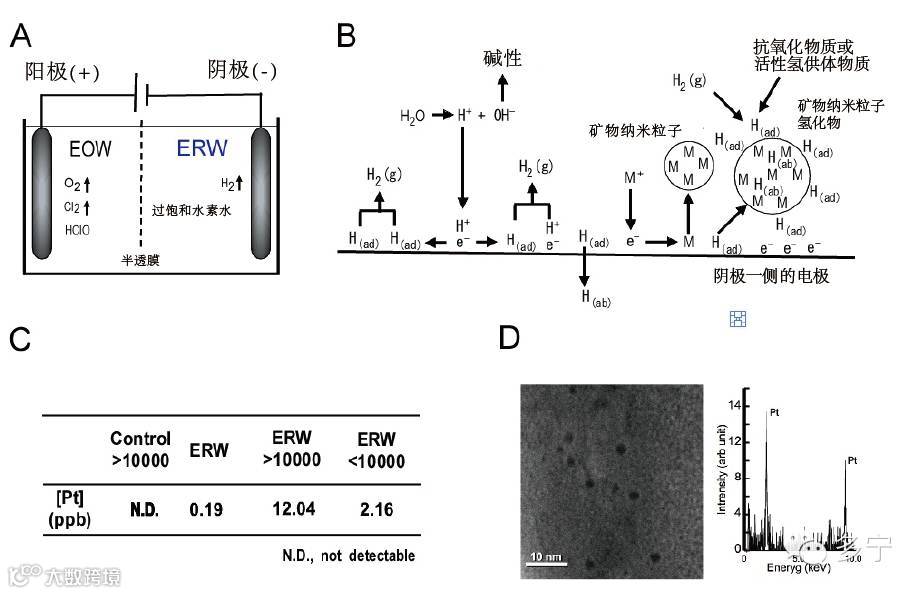 图1.电解还原水、矿物纳米粒子以及矿物氢化物的电化学方式制作原理。A.电解水制作原理。阴极附近的电解还原水是富含分子氢的水。阳极附近的电解氧化水含有氧气、氯气、以及当原水含有氯离子时就含有次氯酸。B.铂金电极表面上的化学反应。从水中分离出来的氢离子与电子结合就被还原,然后被吸附到铂金电极表面变成H原子(Had)。Had在铂金板表面移动(overflow,溢流)后变成H2。部分Had被吸收进铂金内部,变成储存氢(Had)。原水中存在的矿物离子被还原成金属原子后,通过自我建构而变成矿物纳米粒子。被有机保护材料所保护起来的矿物纳米粒子是很稳定的,可长时间(长达数年)地分散于水中。矿物纳米粒子在存在分子氢或有机抗氧化剂等氢气供体的场合下,可吸附储存原子氢。C. 电解还原水(ERW)含有微量的铂金(Pt)纳米粒子。正如Ye et al.,(2008)发表的论文指出,电解还原水是以100V直流电对2mM的NaOH溶液进行电解一小时而制成。电解还原水经过了分离极限粒度10000的超滤膜过滤。用ICPMS对分子量10000道尔顿以上与不足10000道尔顿的分数的铂金含量。对照物是电解之前的2mM的NaOH溶液。D.左侧照片是电解还原水的分数(分子量10000道尔顿以上)的透过型电子显微镜所拍的照片(5000倍)。右图为针对左图的能量分散型X光分光仪分析图,显示纳米粒子仅有铂金构成。