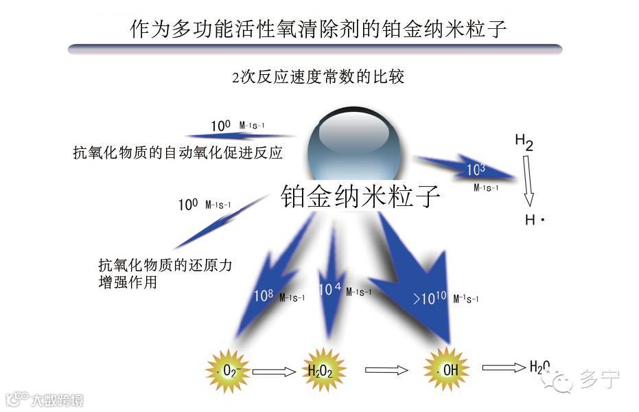 图2. 铂金纳米粒子的多功能活性氧清除活性。2~3纳米的合成铂金纳米粒子的二次反应速度在Hamasaki et al.,(2008)论文中被明确提出来。铂金纳米粒子具有像SOD酶那样的对超氧自由基的清除活性。同时还具有类过氧化氢酶活性。铂金纳米粒子对羟自由基的清除活性与最强效清除剂“抗坏血酸”等物质同等甚至更强。铂金纳米粒子除了能将分子氢活化成为活性氢以外,还能起到增强其他抗氧化剂的还原力的效果。铂金纳米粒子对抗氧化剂的自动氧化活性微弱。标注出来的数据是二次反应速度常数的Ks值。