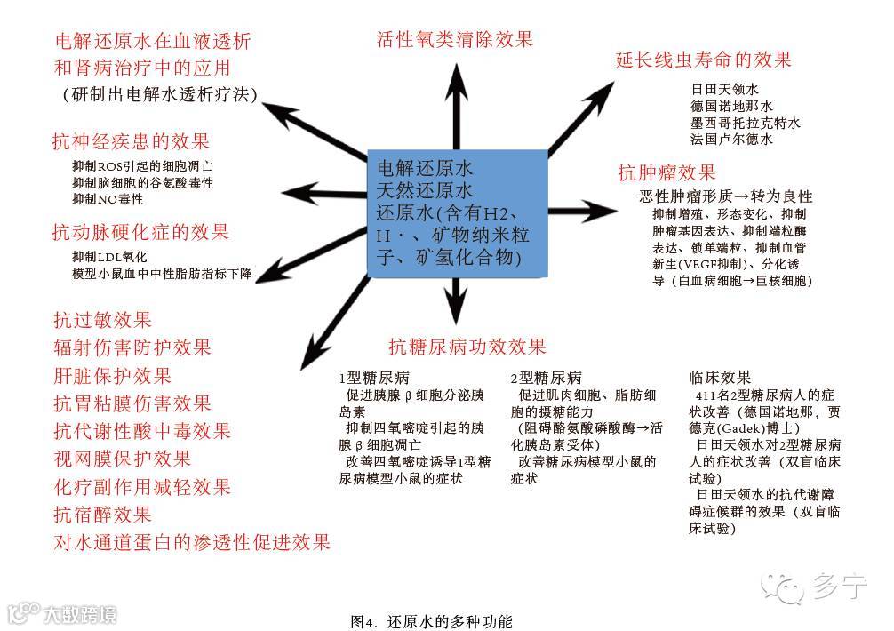 根据积累起来的证据来看,还原水是有益健康的水,显示对糖尿病、癌症、动脉硬化症、神经变性疾病、过敏症以及血液透析副作用等与氧化应激相关的疾病具有抑制作用。清除活性氧的还原水的作用机制很复杂。电解还原水含有分子氢和矿物纳米粒子。现已逐渐清楚分子氢是一种能诱导抗氧化酶的基因表达的新型氧化还原控制因子。分子氢有可能是在金属纳米粒子的触媒(催化)作用下,转变成具有很强还原性的活性氢,然后在体内发挥作用。矿物纳米粒子本身也是新型多功能抗氧化剂。矿氢化合物纳米粒子与抗坏血酸(维生素C)一类的有机抗氧化物质等属同样的还原性物质,也是还原水中活性物质的候选对象。天然还原水可能含有上述活性物质的一种或多种,从而显示出具有还原作用。有关电场、磁场或光照法对水进行活化的方法的更进一步的研究,可能对研发有益我们健康的高能量水大有助益。还原水通过净化羊水和血液,有可能改善妊娠妇女的健康状态以及抑制因环境污染对胎儿造成的伤害。