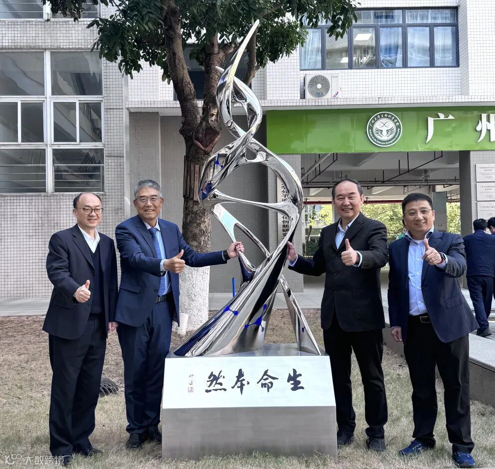 作为爱心企业家代表,广州千江企业集团有限公司的刘小锋董事长赠予广州大学生命科学学院一座名为“生命本然”的雕塑,旨在激发青少年对科学的无限热忱,提升民众的科学素养。刘小锋董事长回忆道,在设计雕塑时,设计师询问他有什么要求,他表示,“要彰显生命的元素,比如DNA,因为这是生命组成最基本的要素。”于是雕塑设计理念以广州大学的羊角标志为基础,在上方巧妙地结合了 DNA 的双螺旋结构,使其延续下去,宛如生命的火焰在燃烧,又似初生的胚芽,充满了希望与能量,同时加入广州塔元素,蕴含着广州大学的智慧,体现了对生命的尊重!