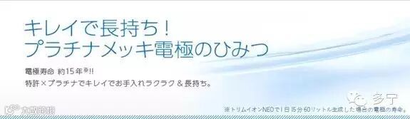 多宁电解还原水机的电极板使用的是首饰中所用的铂金。铂金不容易被氧化,有极佳的耐久性,因此电极板寿命很长,多宁NEO(力欧)长达约1400小时。假设每天使用15分钟制造60公升水的话,能够用约5,600天(15年)。
