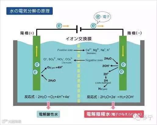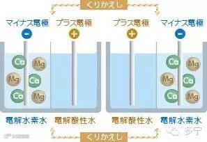 向含有离子的水中通入电流后,就将其分解为分子氢和分子氧,这就是电解。此时,正极一侧生成含氧的酸性水,而阴极一侧则生成含氢的碱性水。与此同时,水中的阳离子向阴极一侧移动,阴离子则向阳极一侧移动。阴极一侧的水就是电解透析水。