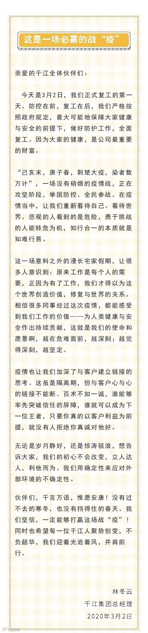 2020开局形势复杂,但我们仍然充满信心,理性面对疫情带来的冲击和影响。下面是集团总经理给千江人的一封信,我们坚信,这是一场必赢的战“疫”。