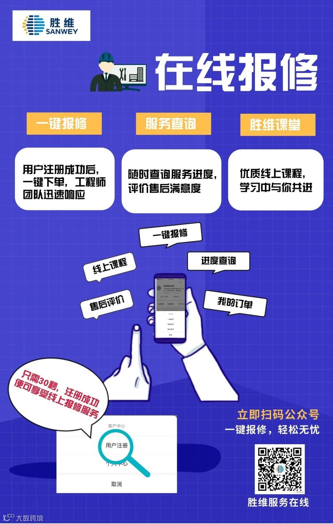 在线报修请扫描海报二维码,关注“胜维服务在线”公众号,马上开启一键报修,轻松无忧。