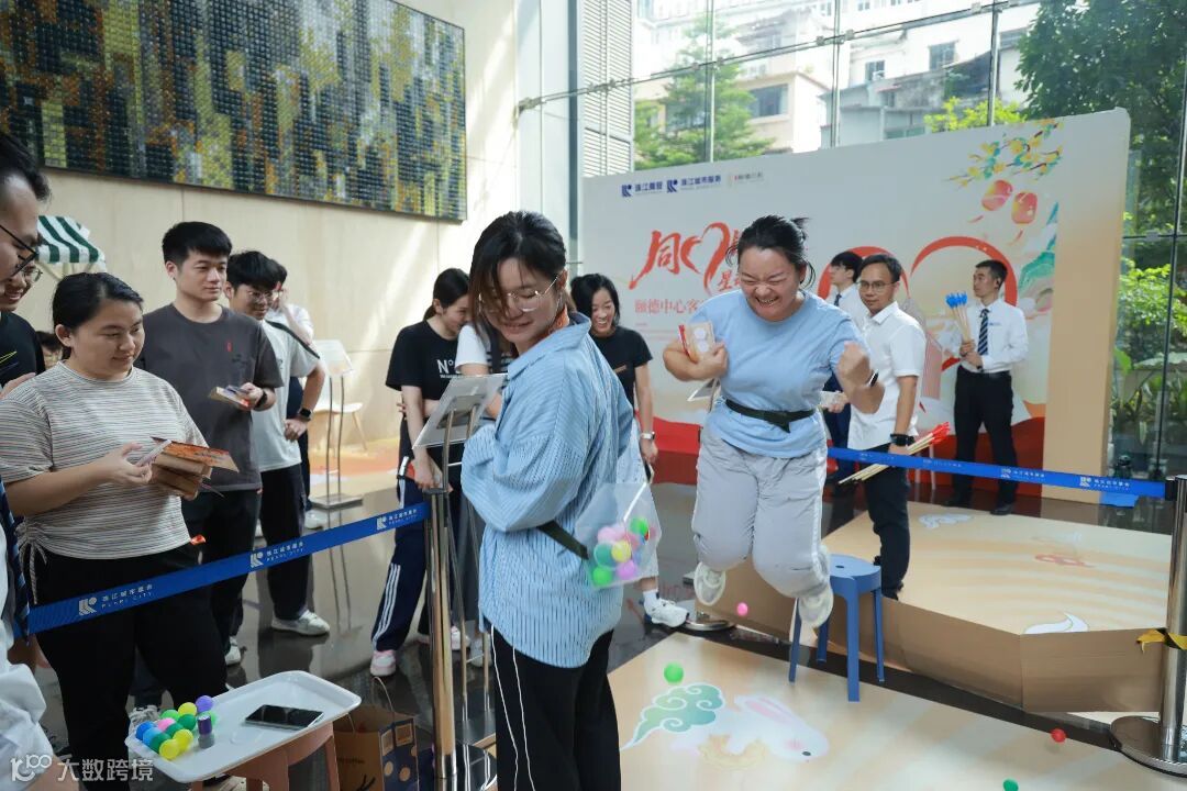 9月28日下午,珠江颐德中心办公大堂洋溢欢声笑语,猜灯谜、投壶、骰子抢座、抖球比赛等互动游戏吸引众多业户参与。胜伦律所、兴业银行、银河证券等重点租户代也来到活动现场驻场参与互动,与大厦租户共同体验游戏乐趣,集章兑换星动空间体验券、幸福工坊茶饮等特色礼品,现场气氛温馨而活跃。