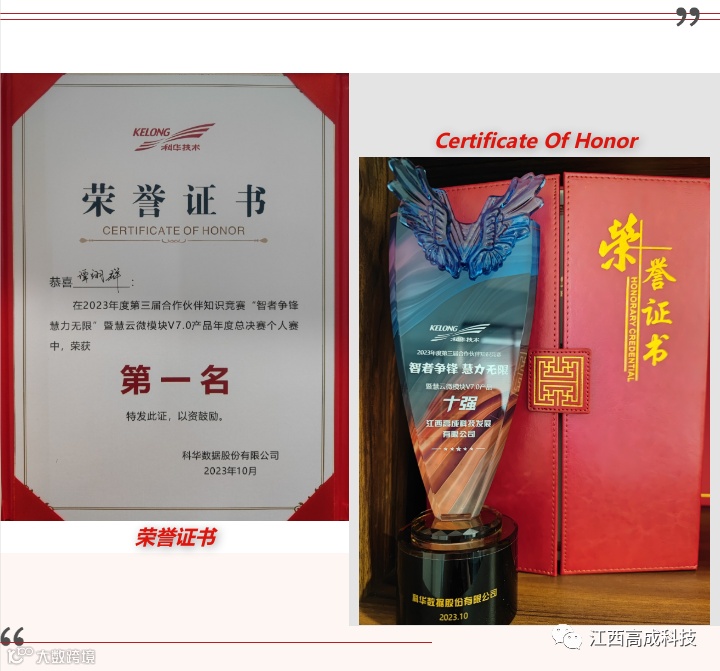 2023年10月13日,科华数据股份有限公司在厦门举办合作伙伴知识竞赛,参赛人员来自全国20+以上城市地区,达数百人之多,竞争之激烈可见一斑。江西高成科技发展有限公司售前经理谭翊群先生,在赛场上从容不迫,一路披荆斩棘,荣获2023年度第三届合作伙伴知识竞赛“智者争锋,慧力无限”暨慧云微模块V7.0产品年度总决赛个人赛中荣获“第一名”的好成绩!