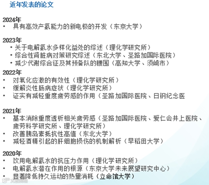 先后发表的电解氢水相关论文截至2024年底已多达48篇,与多宁开展合作研究的主要大学和研究机构有理化学研究所、立命馆大学、东京大学未来展望研究中心、东北大学、九州大学、带广畜产大学、高知大学、神户大学等。