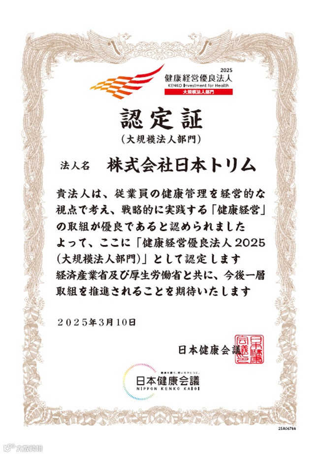 日本多宁公司已经连续六年获得“健康经营优秀法人”认证,其生产的电解氢水整水器也被很多致力于健康经营的企业采纳、引进,供员工们日常饮水所需,其中一些员工体验到电解氢水好处后,也购买安装在自己家里,便于一家老小饮用和煮饭料理使用。