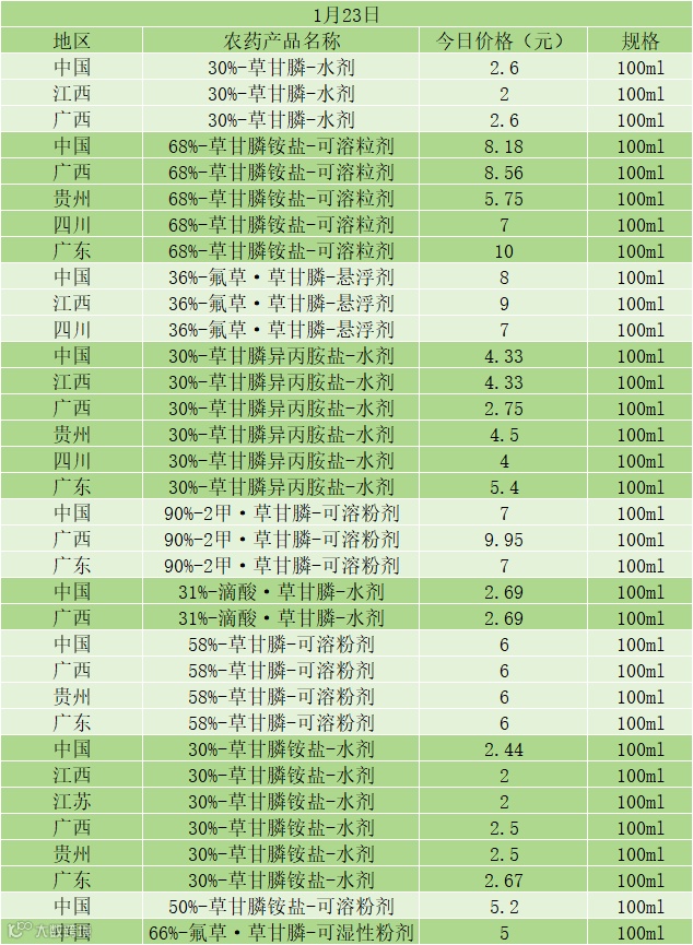 📅 1 月 21 日草甘膦类农药零售价(100ml 规格)