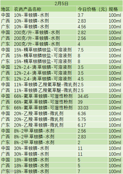 📊 2 月 5 日草铵膦系列产品零售价(100ml)