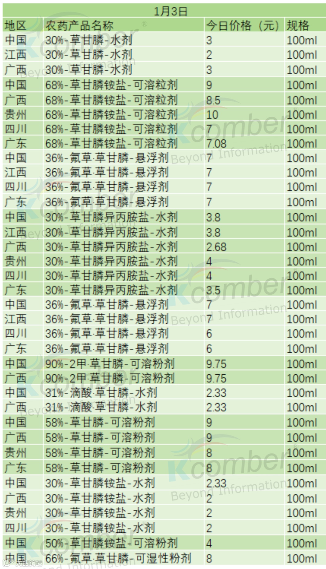 📅 1 月 3 日草甘膦类农药零售价(100ml 规格)
