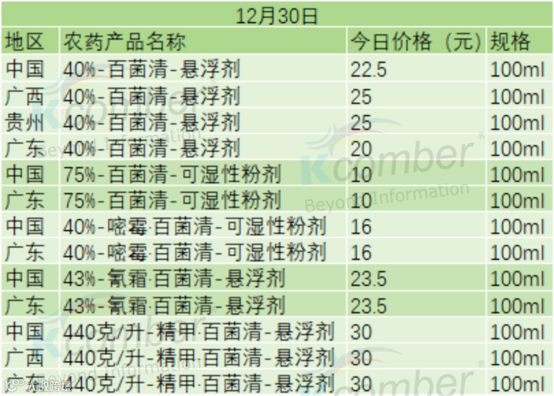 📅 12 月 30 日百菌清类农药零售价(100ml 规格)