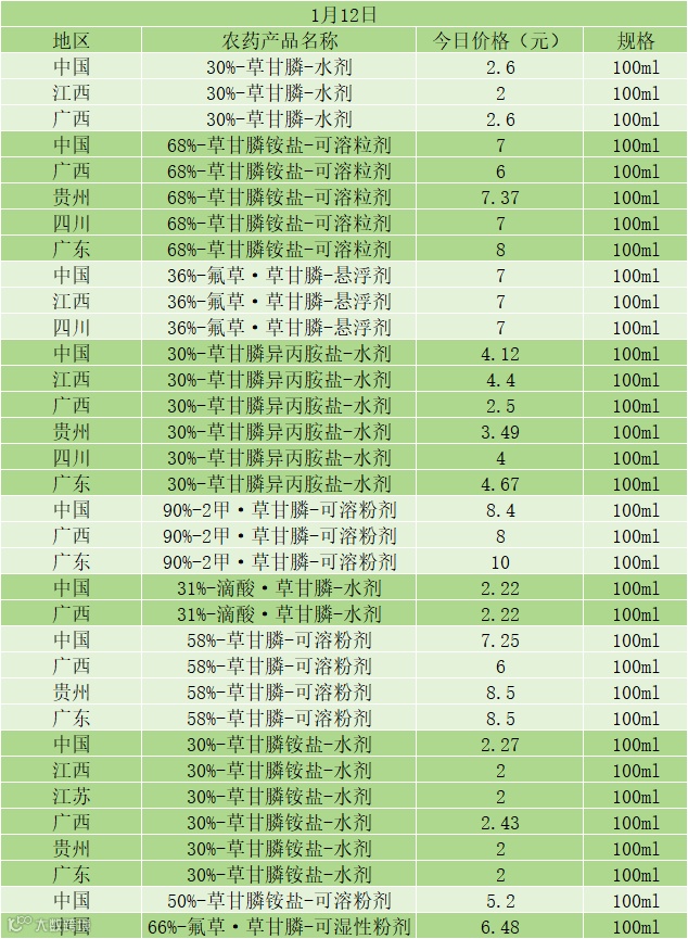 📅 1 月 12 日草甘膦类农药零售价(100ml 规格)