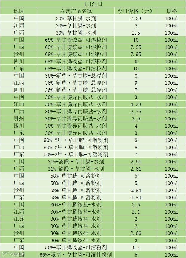 📅 1 月 21 日草甘膦类农药零售价(100ml 规格)