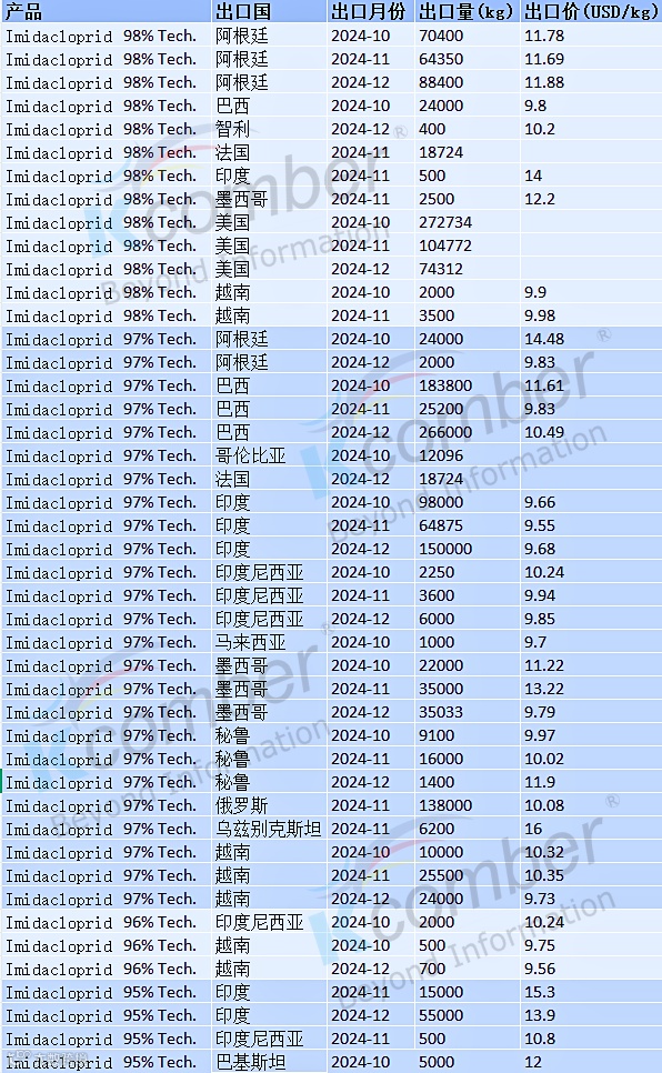 2024年第四季度,吡虫啉原药(98%、97%、96%、95% Tech.)出口表现总体平稳,南美、亚洲与部分欧美市场为主要流向。不同规格产品价格差异明显,且同一市场在不同月份呈现波动。以下为2024年10–12月吡虫啉主要出口国量价数据分析。