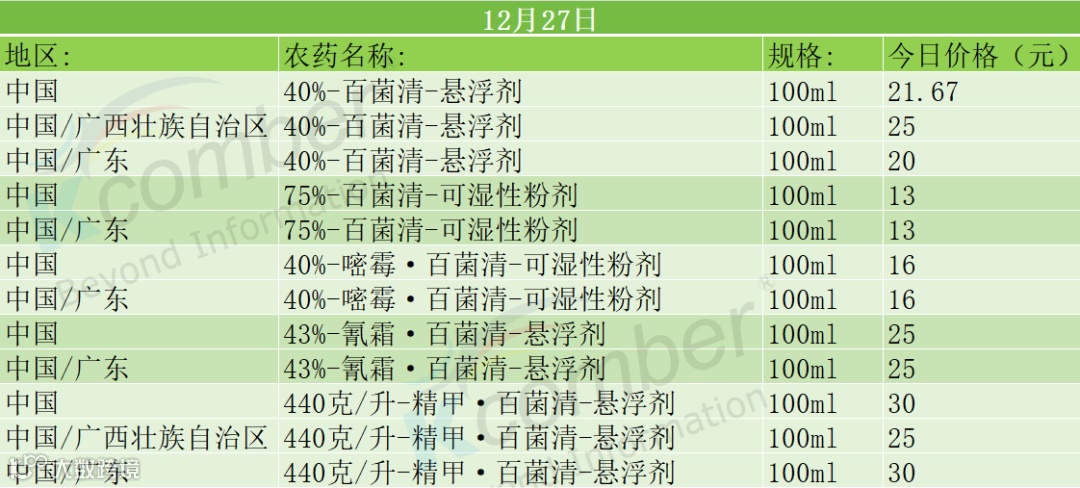📅 12月27日百菌清及复配制剂主要市场零售价(100ml)