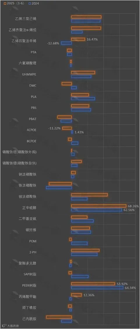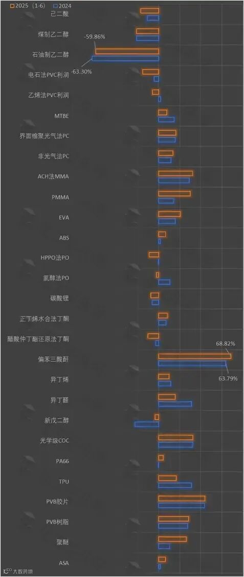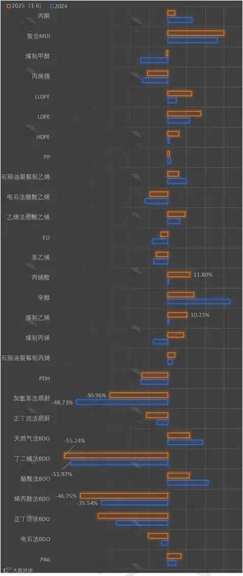 值得关注的是,部分化工品在上半年实现了利润的显著增长。丙烯酸的利润率从2024年的0.52%(盈亏平衡附近)飙升至11%,同比暴涨2181%,主要得益于市场价格上涨13%。煤制乙烯的利润率也从0.47%提升至10%以上,涨幅达2097%,动力煤价格的大幅下跌成为关键推手。乙烯四聚法辛烯则从亏损12%转为盈利16%,乙烯价格下跌7%为其提供了利润修复空间。