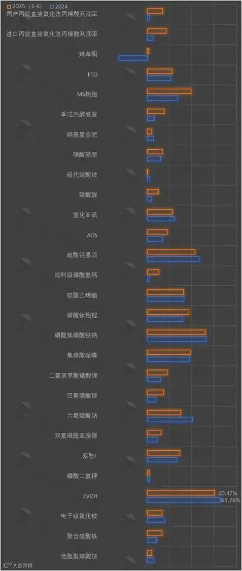 在盈利产品中,偏苯三酸酐以68.8%的平均利润率位居榜首,但其价格走势犹如过山车,从2024年2月启动上涨,至2025年2月触及5万元/吨的高点后开始持续回落,目前已跌回上涨前水平。若按当前价格计算,其利润率已降至35%左右。正辛硫醇紧随其后,上半年平均利润率达68.3%,较2024年提升3个百分点,市场需求持续向好。EVOH(乙烯-乙烯醇共聚物)则以60%左右的利润率排名第三,其价格波动相对温和,利润空间稳定,展现出新材料产品的典型优势。