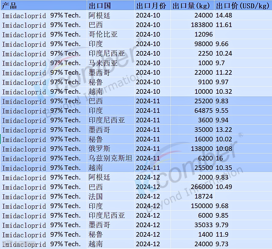 巴西为最大采购国,尤其在12月单月出口量达 26.6万kg,价格稳定在 10.49 USD/kg。