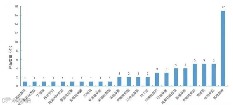 对具体有效成分的分析显示,市场资源正向少数高效、广谱的"明星"品种高度集中。除草剂领域,砜吡草唑以17个登记数量一枝独秀,显示出其卓越的市场潜力。苯嘧磺草胺、环磺酮和唑啉草酯各5个形成了稳固的第二梯队。精草铵膦铵盐、氟噻草胺等品种亦表现活跃,共同构成了当前除草剂原药的研发与登记热点。