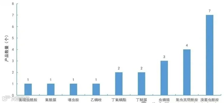 杀虫剂领域,以邻甲酰胺类为代表的高效杀虫剂继续主导市场。溴氰虫酰胺7个和氯虫苯甲酰胺4个的登记数量合计占据该品类半数以上份额。虫螨腈3个也保持着较高的市场关注度。