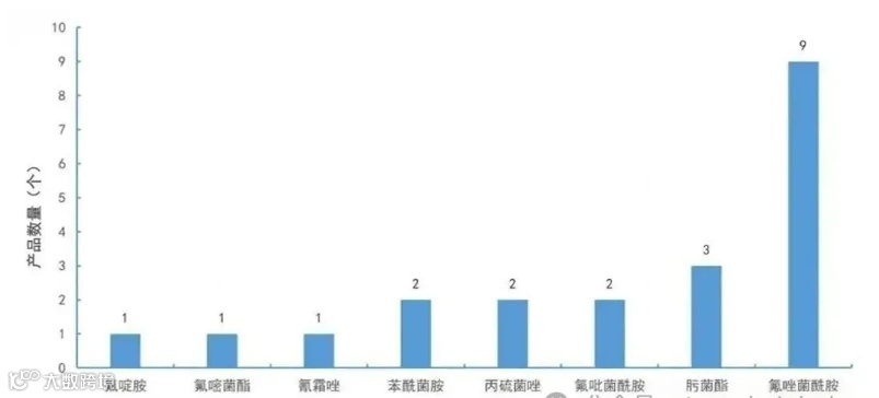 杀菌剂领域,氟唑菌酰胺以9个登记数量脱颖而出,其市场优势地位进一步巩固。肟菌酯3个作为经典品种,依然是企业布局的重点。此外,苯酰菌胺、丙硫菌唑和氟吡菌酰胺等也具备较强的市场竞争力。