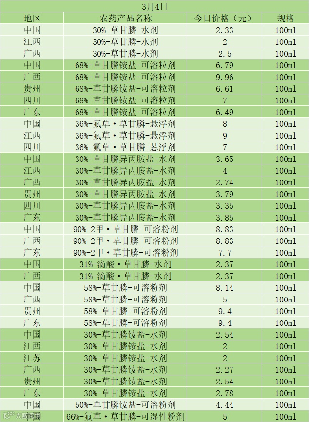 30%- 草甘膦 - 水剂:中国 2.33 元、江西 2 元、广西 2.5 元