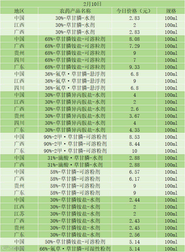 📅 2 月 10 日草甘膦类农药零售价(100ml 规格)