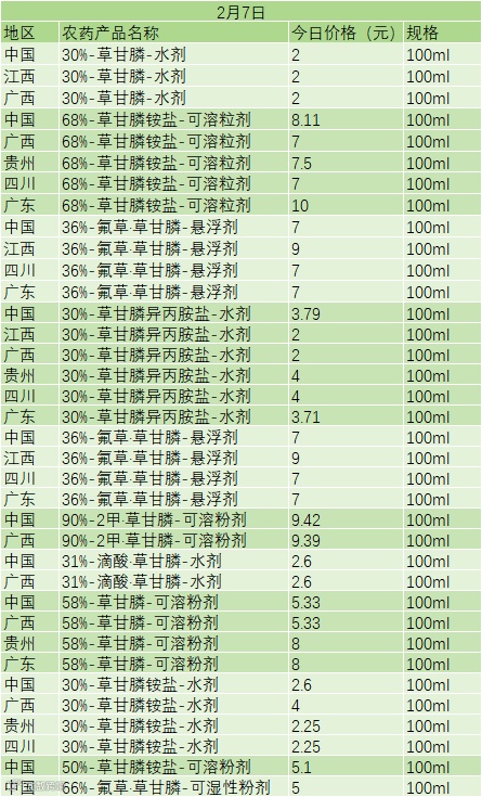 📅 2 月 7 日草甘膦类农药零售价(100ml 规格)
