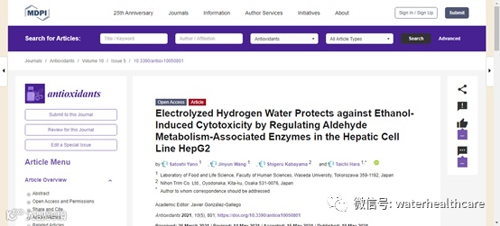 2021年5月19日科学期刊“Antioxidants”刊发了早稻田大学和日本多宁联合研究论文“Electrolyzed Hydrogen Water Protects against Ethanol-InducedCytotoxicity by Regulating Aldehyde Metabolism-Associated Enzymes in the HepaticCell Line HepG2”(电解氢水通过调节肝细胞系 HepG2 中的醛代谢相关酶来防止乙醇诱导的细胞毒性)