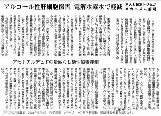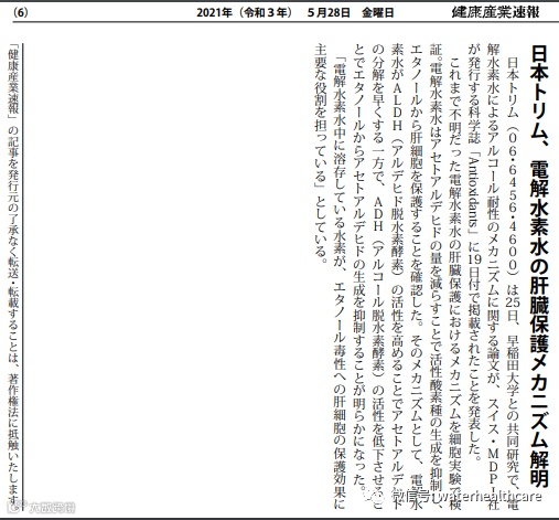 5月28号日本“健康产业速报”刊发了题为“日本多宁解开了电解氢水护肝作用机制”的新闻。