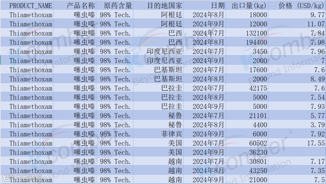 2024年7–9月,噻虫嗪出口稳定推进:主力市场坚挺,高价单频繁出现,南美与亚洲之间的价格梯度正在拉开。这是短期波动,还是下一轮行情的前奏?