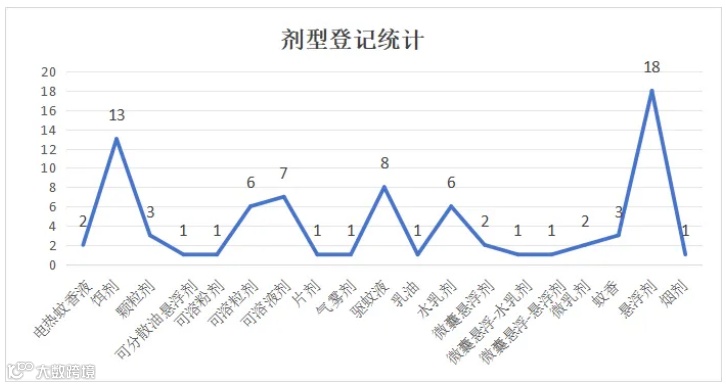 在剂型分布方面,悬浮剂以18个登记数量位居榜首,其使用方法主要为喷洒和滞留喷洒,适合家庭、公共场所等大面积处理;饵剂以13个登记数量紧随其后,主要包括杀蟑饵剂和杀虫饵剂,这类产品针对性强,使用方便;驱蚊液登记数量为8个,主要用于个人防护;可溶液剂7个,可溶粒剂和水乳剂各6个,这些剂型也多采用喷洒方式使用12。