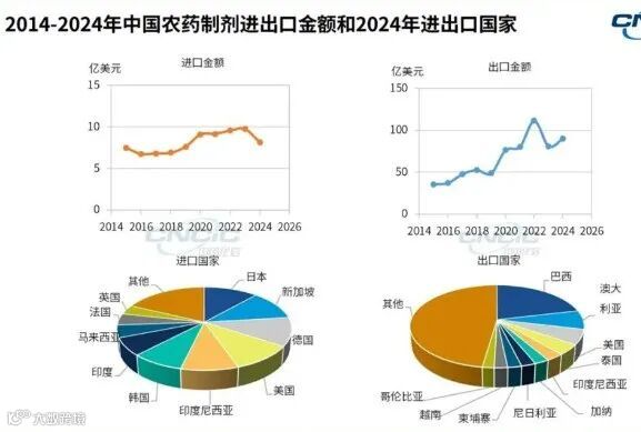 中国原药出口占比从2022年92万吨降至2023年73万吨,2024年回升至91万吨,但仍低于制剂出口量(109万吨);
