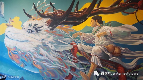 站在壁画中龙神的鼻尖处的就是日本古代传说的掌管温泉、健康和医药的神——“少彦名命”