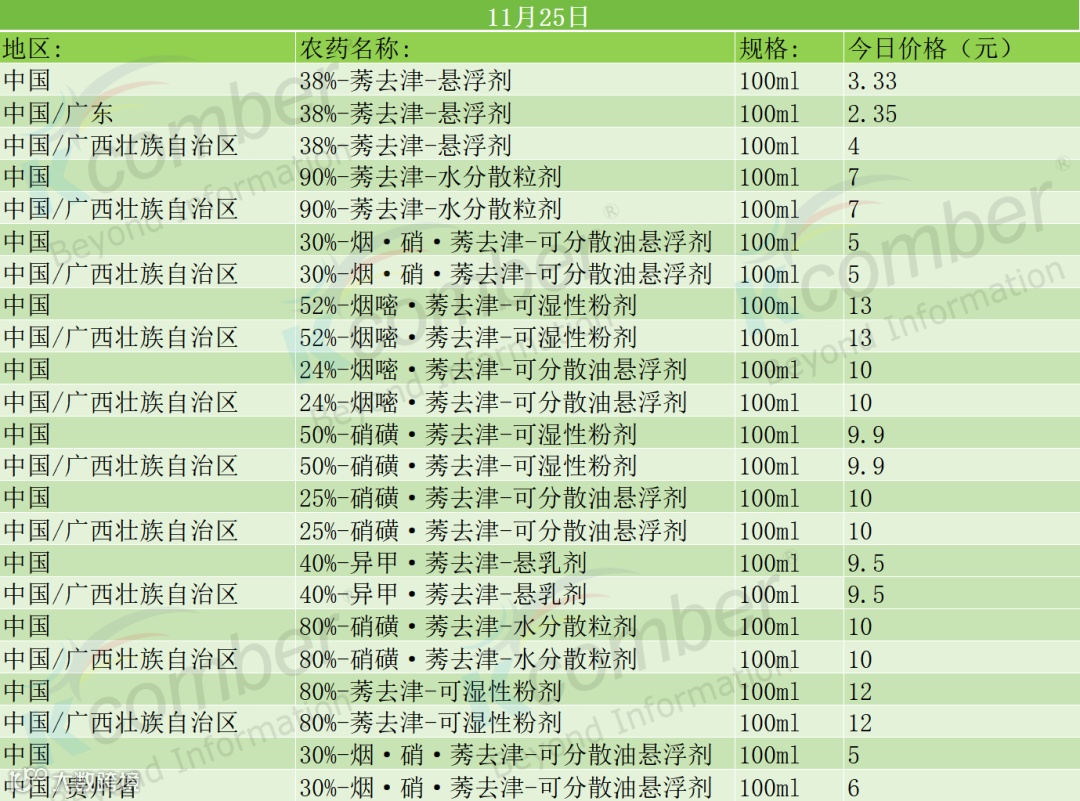 38% 茅去津悬浮剂:全国主流报价在3.33元,广东报价略低至2.35元,广西则相对偏高至4元。