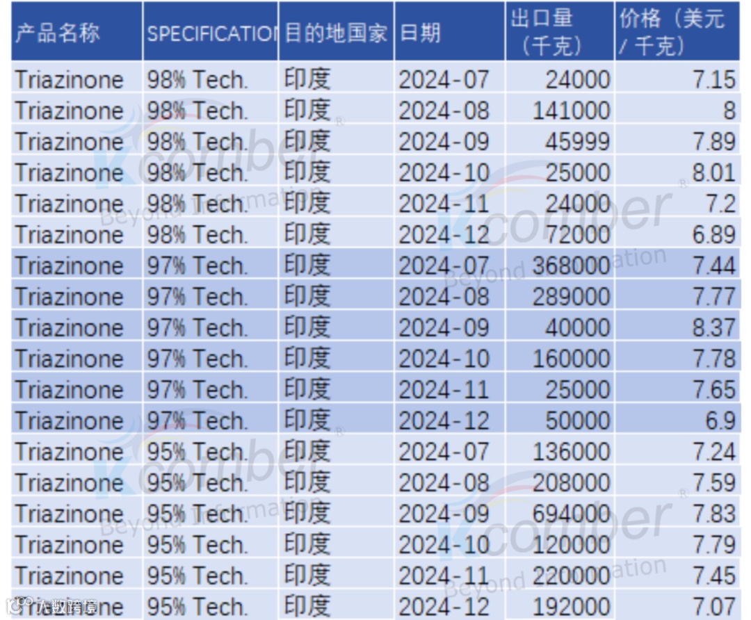 2024年下半年,中国出口至印度的Triazinone(灭草松)整体维持高位运行,量价走势呈现“前高后稳”的节奏。