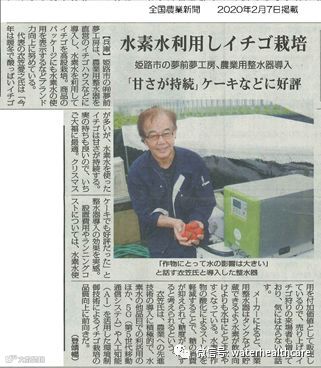 2020年2月7日全国农业新闻报文章“用电解氢水种植草莓,甘甜持久,好评如潮,甚至被用到糕点制作等方面”