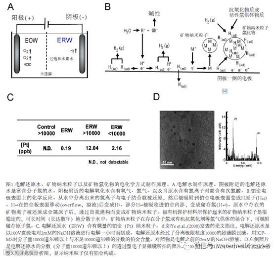 功能水被定义为“带有特殊功能的、被活化了的水”。活化方式各式各样,比如电解方式、磁场处理、光照射、超声波处理、气体曝气、强水流冲撞、利用某种矿物或岩石进行处理,等等。根据日本机能水学会的定义,功能水是指在人工处理的各种水中,在治疗及功能这两方面上均已被证实或者即将被证实的水,或者能够再现的已被证实或即将被证实具有有益功能的水。另一方面,本研究室发现在天然水中也存在像天然还原水那样具有突出功能的水,这些水也应该被归类到功能水中。在所有功能水里面,电解水是被研究得最透彻的。利用电化学方法还原以后的水(electrochemically reduced water,ERW、电解还原水)是在电解槽的阴极附近生成,而电化学方式氧化的水(electronchemically oxidized water,EOW、电解氧化水)则是在阳极附近生成。正如本篇论文所论述的,可饮用的电解还原水是有益健康的水。电解氧化水也被称作电解酸性水,是一种主要在次氯酸、氯气和臭氧的作用下具有杀菌功效的功能水(Bari,Sabina,Isobe,Uemura,& Isshiki,2003)(图1A)。