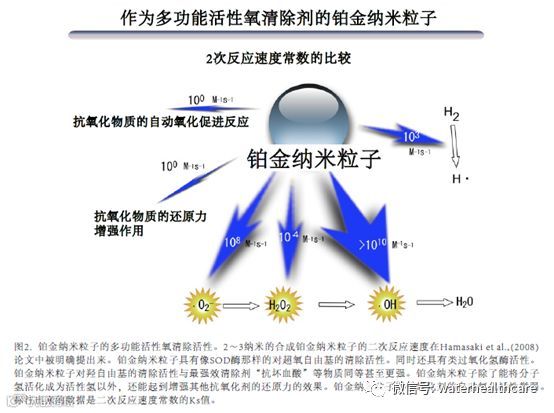 市面上销售的电解还原水制造装置大多使用钛板表面电镀铂金的电极板。铂金是一种被许可可作为食品添加剂的安全性金属,具有优异的产生氢的能力。自来水和天然水中含有钙、镁离子等各种各样的矿物离子。这些矿物离子在阴极表面得到电子后变成矿物原子。矿物原子具有自我构建形成矿物纳米粒子的特性。数个纳米程度的微细纳米粒子不会沉淀,只要条件适合的话能稳定分散存在水中长达数年以上。数个纳米程度的纳米粒子以很高比例保持着有很强活性的表面原子,具有很强的触媒(催化)活性。而且,由于其具有隧道效应等特殊的量子效应,所以其在工业产品、药品、化妆品、食品等许多领域上的应用研究工作正在广泛开展。电解还原水中,估计含有来自于原水的由各种矿物离子生成的矿物纳米粒子及矿物纳米粒子氢化物(图1B)。一般认为离子化倾向较弱的铂金、黄金、钒、钯等金属纳米粒子的存在时间比较长,但推断经过缓慢释放电子后就会恢复成原来的离子状态。最近已经知道离子化倾向较强的镁离子和钙离子也能在很强的还原作用下生成稳定的氢化物MgH2和CaH2。因为矿物纳米粒子也能释放被储存起来的氢,所以能释放出更多的电子和氢。实际上把MgH2和CaH2等氢化物作为能在水中徐徐释放氢的能量物质在氢燃料电池和抗氧化食品中的应用研究一直在进行中(请参考补充材料)。自来水和天然水中由于含有多种矿物离子、有机或无机化合物,因此一直以来都认为要解开以这类水为原水的电解还原水的作用机制并非一件易事,正因如此,我们就采用与自来水同等水平电导率的氢氧化钠(NaOH)溶液制成的电解还原水作为研究用的模型水,来研究其化学及生物学功能。如图1C和D所示,以NaOH溶液为原液的电解还原水在经过减压浓缩器进行浓缩之后,再用10000截留分子量的超滤膜进行分割发现,截留下来的部分中存在1~10纳米大小的铂金纳米粒子(图1C和D。请参考补充材料)。因为原水中基本上不存在铂金离子,所以可推断这些铂金纳米粒子是从铂金电极板上析出的。在电解还原水的模型水中,我们推断在微量的铂金纳米粒子的触媒作用下,活性氢能从分子氢中稳定地产生出来。因此证明了从铂金离子合成多种尺寸的铂金纳米粒子,且在分子氢与铂金纳米粒子同时存在的情况下能稳定地生成出活性氢。而且,经过从反应速度角度对这些合成的铂金纳米粒子的活性氧类清除效果进行分析时发现,合成铂金纳米粒子具有与SOD酶同等水平的清除超氧自由基(O2.-)的效果。同时还以与抗坏血酸(维生素C)和谷胱甘肽酶等同等甚至更高的效率清除掉了最具危险性的羟自由基(·OH)。不但如此,虽然触媒效率比不上过氧化氢酶,但它仍可以清除过氧化氢(H2O2)(Kajita et al.,2007;Hamasaki et al.,2008)(图2)。铂金纳米粒子是一种物质,而且已明确它是具有类SOD活性、类过氧化氢酶活性、羟自由基清除活性的多功能抗氧化物质,与酶不同的是它很稳定,所以即使微量也可能具有生理活性。事实上,已经发现电解还原水模型水中所含2ppb左右的微量合成铂金纳米粒子延长了线虫的寿命(Yan et al.,2011)。