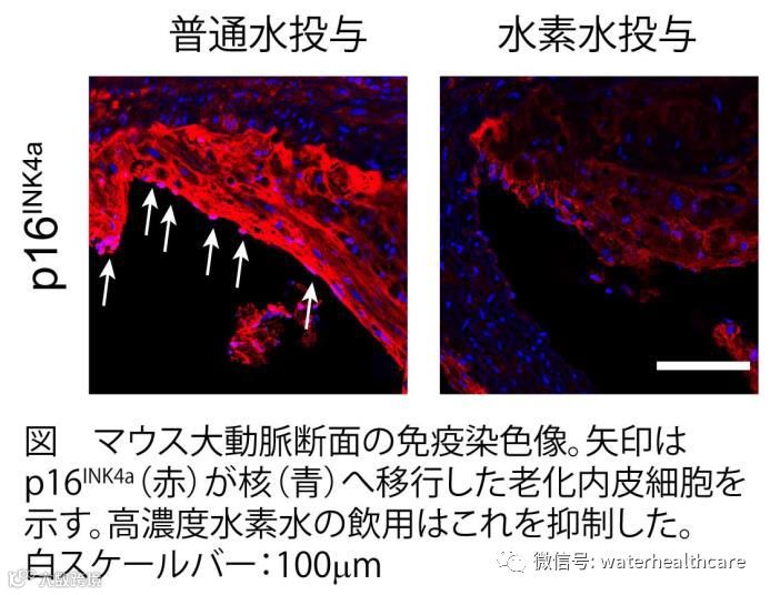 当给动脉粥样硬化模型小鼠喂食高脂肪饮食时,发现主动脉血管内皮细胞衰老指标的p21和p16INK4a(注3)的表达升高并局部影响到细胞核,确认到细胞老化的进程。另一方面,常喝高浓度氢水的小鼠身上的细胞老化得到了抑制(图)。此外,还抑制了巨噬细胞向血管内皮的浸润,并且血管中炎性物质的表达也受到了抑制。这些结果表明,通过饮用高浓度氢水可以抑制带来动脉粥样硬化病变的血管内皮细胞老化。
