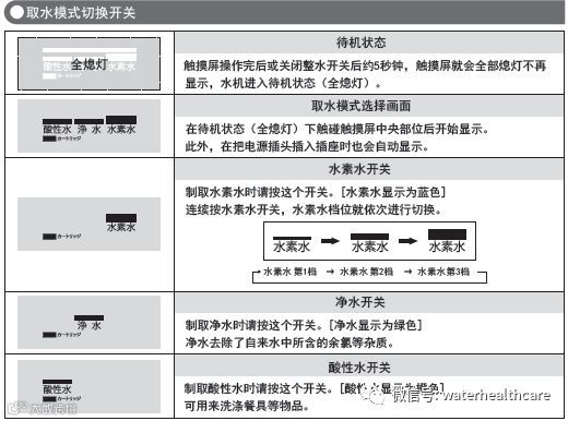 手指触碰到触摸屏中央就显示出取水模式选择画面。然后选按相应的取水模式,再拧开整水开关,即可轻松取用您所选择的水。