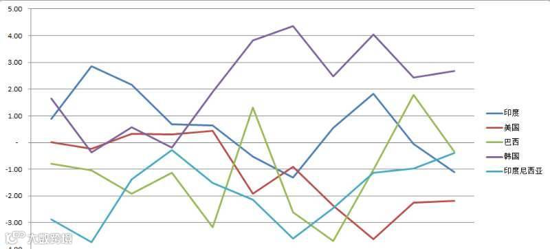 图3:2016年 1月~11月钛白粉5大出口国价格指数与全球平均指数的对比(设定值为0)
