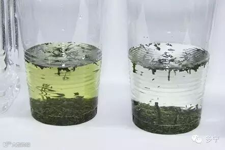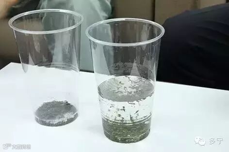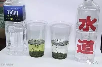 首先我通过小小的实验为你介绍一下这种水的特点。我预先准备好装有茶叶的两只杯子,我们向其中一个注入普通的自来水,另一个注入电解水素水。