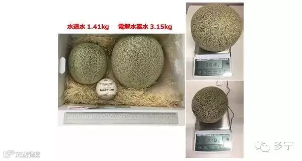 奥:左边的是用普通的地下水栽培,右边的是用我公司农用整水器制造的电解水素水栽培出来的,是左边大小的两倍啦,差不多有足球那么大!前几天莅临签约仪式的高知大学的老师说了,他注意到用电解水素水栽培的哈密瓜纹路很细密,“这表示不是因为细胞肥大后长得更大个,而是在保持正常细胞的大小的基础上细胞不断分裂后长大的”。这有何不同呢?一般来说,越大的哈密瓜其纹路也应该越大,可是电解水素水栽培出来的瓜与普通的瓜比较就会发现,其纹路大致上是一样的,只是个头更大了。