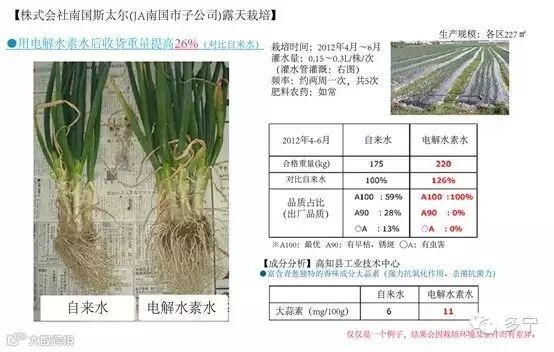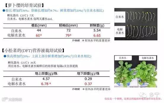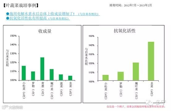 吉:总共采集了6种叶蔬菜的数据,多的采集了6次,历时2~3年反复栽培,与用普通水栽培时相比,产量确实增长了。虽然数据上有些差异,但所有品种都未出现反而变差了的结果,因此电解水素水肯定是多种作用的,论证工作正在进行。